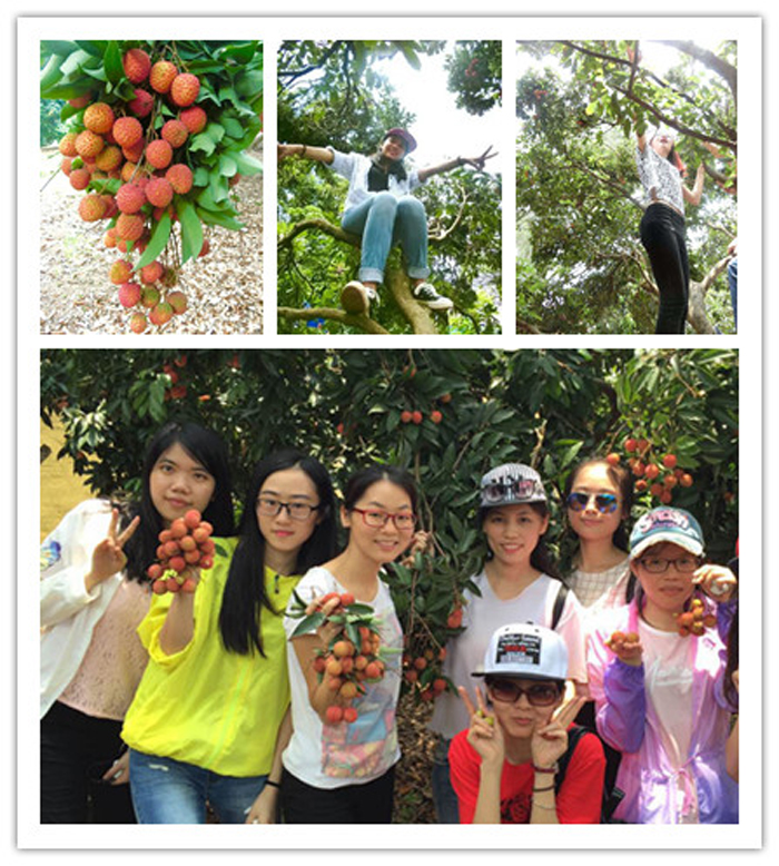 在这个时节,树上的荔枝先后成熟,红色的荔枝让农庄充满色彩。百利来的美女们志勇兼备,有的攀爬到枝头,有点拿着工具巧妙剪下荔枝。刚摘下来的荔枝清甜爽口,美味极了!公司为每位员工买上一些带走,回去继续大饱口福。