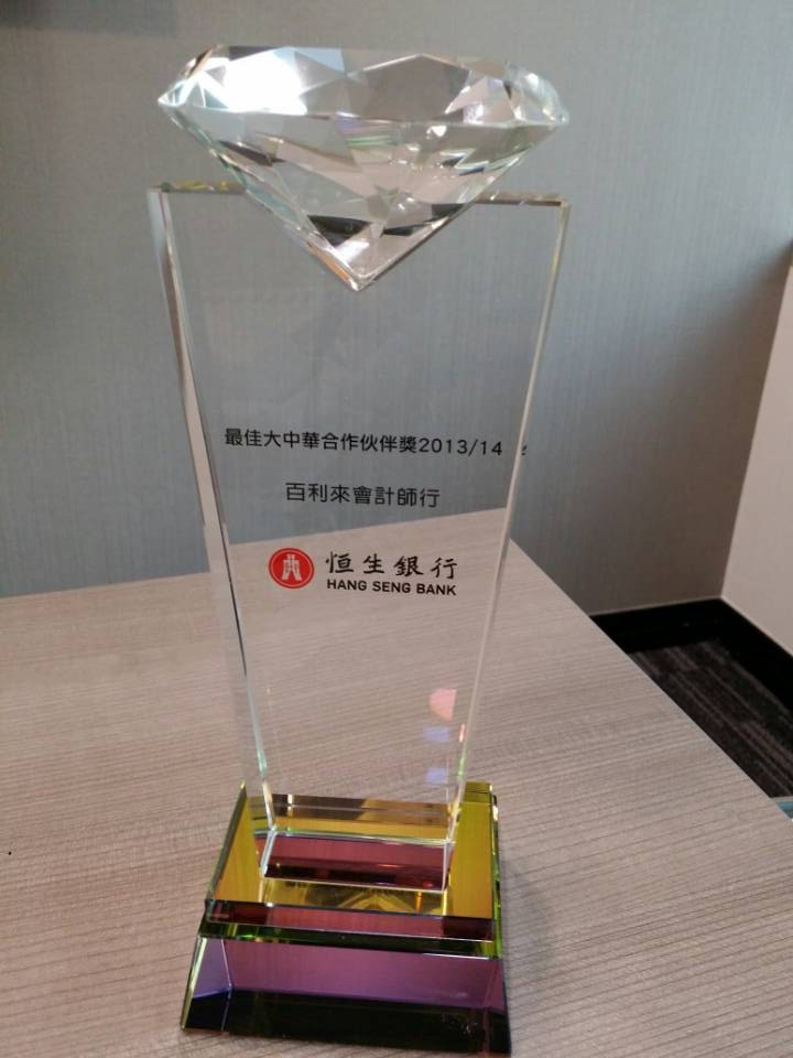 2014年8月8日,香港百利来行荣获恒生银行为我们百利来颁发的“2013/2014年度恒生银行最佳大中华区合作伙伴奖”,这是本年度恒生银行 颁发的第一家最佳合作伙伴奖,百利来行表示无限荣幸。银行方负责人强调这个奖只有极少几家机构获得,是经过多方资质调查确认,严格筛选,银行多层审 批而确定授予的奖项,获得此荣誉的公司也是恒生银行非常珍贵的合作伙伴。同时,也是百利来连续五度蝉联其他国际知名银行专业顾问伙伴奖之后再次获奖。