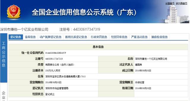 查询工商信息系统发现,“深圳市赚他一个亿实业有限公司”在9月5日注册成立,注册资本为250万元人民币,法定代表人唐国典。