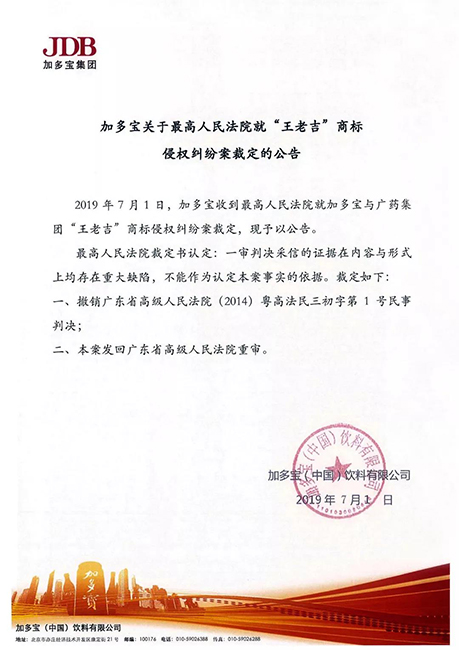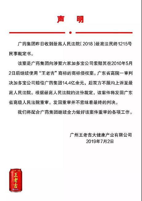 2019年7月,加多宝(中国)饮料股份有限公司发布公告称,加多宝收到最高人民法院就加多宝与广药集团“王老吉”商标侵权纠纷案裁定。
