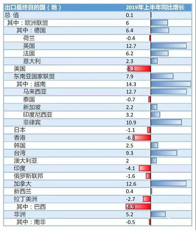 值得注意的是,2019年上半年中国对美国出口下降8.1%;与此同时,对欧盟出口增长6%;对东盟出口增长8%,其中,对越南的出口额增长了14%!