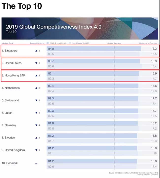在新加坡的带领下,东亚和太平洋地区是世界上拥有竞争力国家的地区,其次是欧洲和北美。香港特别行政区(第3名)和日本(第6名)也位居前十名。