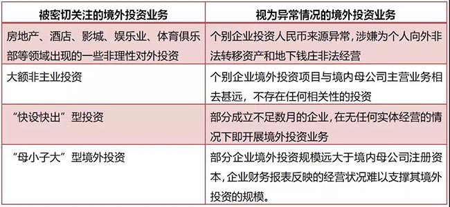 另外,2017年8月18日国务院发布的《国务院办公厅转发国家发展改革委商务部人民银行外交部关于进一步引导和规范境外投资方向指导意见的通知》,对境外投资实行了“鼓励发展+负面清单”模式,明确将境外投资分为鼓励、限制和禁止三类。
