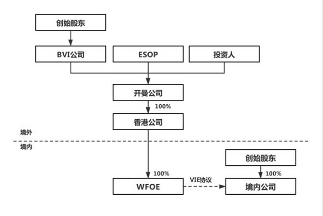 本文仅从已经信息公开的境外上市案例角度出发,分析、总结投资者完成投资VIE架构,企业的常见投资架构如下: