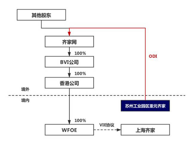在近期赴港完成上市的新经济企业中,Qeeka Home(Cayman)Inc.(简称“齐家网”)的部分境内机构投资者系采用了境内不持股VIE公司+境外直接持股的方案,具体情况如下: