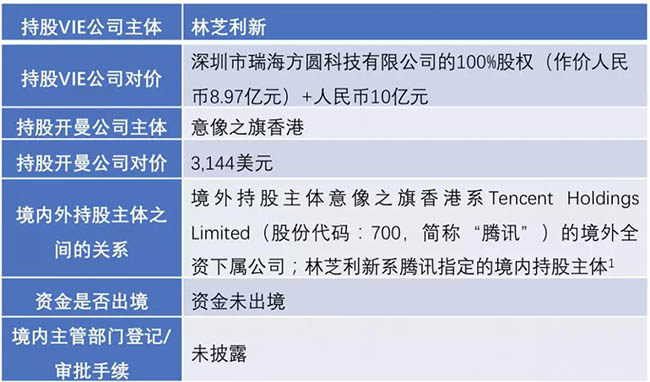 注:腾讯在公开文件中均未披露意像之旗香港与林芝利新之间的关系,亦未披露林芝利新是否为腾讯的VIE公司或其与腾讯的关系。但基于腾讯投资猫眼娱乐的具体信息,林芝利新穿透后的股东均为腾讯员工,且林芝利新为腾讯指定的境内持股主体,我们理解林芝利新与腾讯的境外下属公司意像之旗香港之间可能存在同一利益关系。