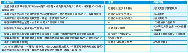 (一)减免非住宅用户每个月75%的水费及排污费,减免额每户每个月2万港元,排污费12500元,为期四个月,至明年3月31日。特区政府收入减少3.4亿港元,约有25万个非住宅用户受惠。