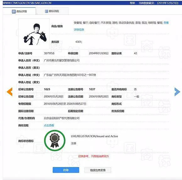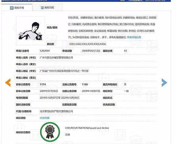 查阅中国商标网可以留意到,真功夫近年来已获得了不少“功夫龙”形象的注册商标,其中部分商标的注册时间已超过了5年,对于这些商标,游云庭表示,李小龙公司可能只能通过诉讼获得一定的赔偿,但很难制止真功夫继续使用。