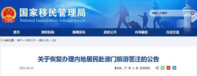 如无特殊情况,8月26日起广东省公安机关出入境管理部门恢复办理广东省居民赴澳门旅游签注;