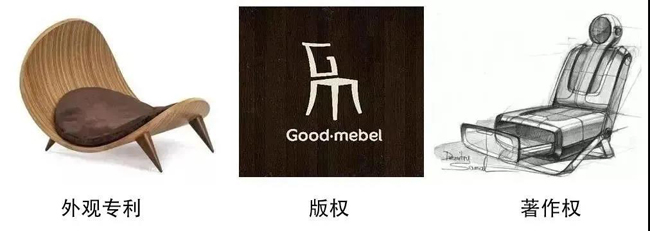 如下图,左边的具有特殊外形的椅子可以申请外观专利,中间经过设计抽象化,具有美感的Icon可以申请版权,最右侧椅子的设计稿本身就带有著作权(天生的)。