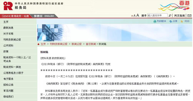 香港政府周五(1月29日)刊宪《2021年税务(修订)(附带权益的税务宽减)(Tax Concessions for Carried Interest)条例草案》(《条例草案》),就基金管理公司及雇员获发的附带权益,豁免全部利得税和薪俸税,并将在2月3日提交立法会进行首读。