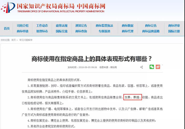 商标使用的具体表现形式之一是将商标使用在与商品销售和服务有联系的交易文书、文件资料上。