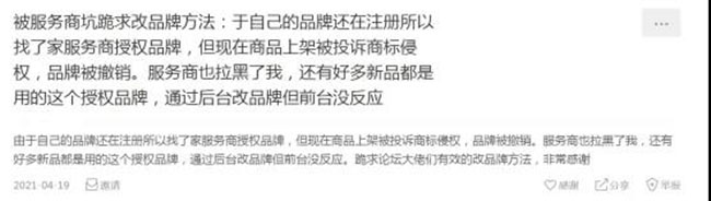 有的卖家因为自己的品牌还在注册,就找了家服务商【授权品牌】,结果是商品上架之后被投诉商标侵权,品牌被撤销。