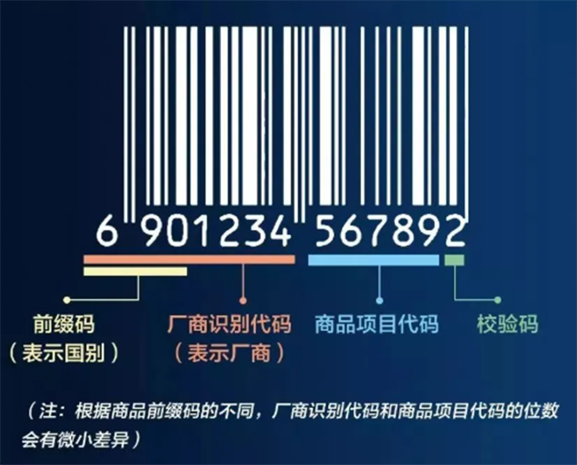 通用商品条形码一般由前缀部分、制造厂商代码、商品代码和校验码组成。商品条形码中的前缀码是用来标识国家或地区的代码,赋码权在国际物品编码协会,如69代表中国大陆,471代表中国中国台湾地区,489代表中国香港地区。