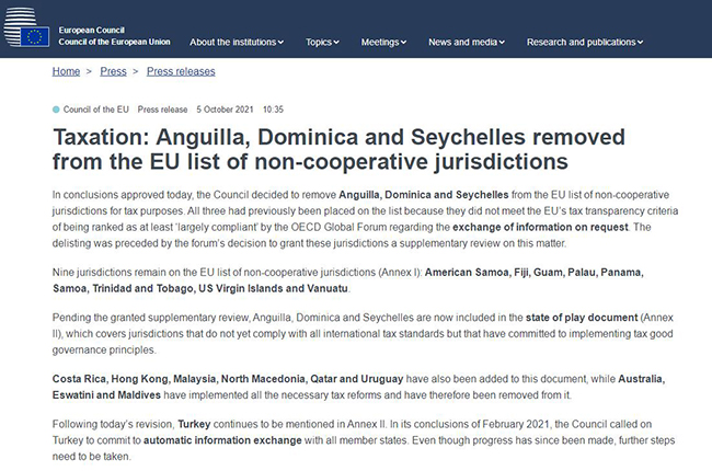 宣布将安圭拉、多米尼加和塞舌尔从欧盟不合作名单中删除。