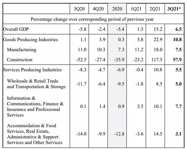 据新加坡贸易与工业部公布的数据显示,今年第三季度新加坡经济同比增长6.5%,连续第三个季度正增长。