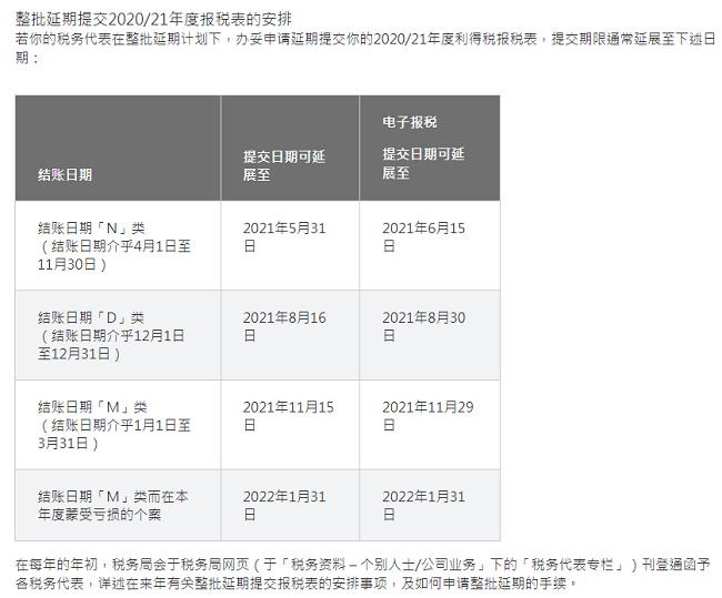 请看下表,根据具体的结账日不同可延期的时间也有所区别,另外由于现在税局疫情影响,M类亏损的公司提交税表的时间已经由到2022年3月31日再次延续到2022年4月30日了。
