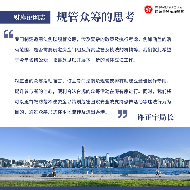 香港目前没有专门规管众筹的法例,也没有特定政府部门对此作出规管。社会一直有意见认为政府应制定适用的法例及规管安排,让正当的众筹活动「有法可依」,同时打击违法行为。多位立法会议员曾就此向我表达意见,我深感认同,亦曾于今年二月在立法会表示政府正初步研究众筹相关法例。当中,我认为需要重点防范及打击的是以众筹方式募集资金,策划危害国家安全活动的违法行为。我们有需要制定适当的规管制度,杜绝任何人或组织直接或间接以众筹手段为危害国家安全活动筹集资金,亦须切断逃亡海外不法分子在香港的众筹资金链。我们对如何规管众筹有一些初步想法,现向大家简介如下: