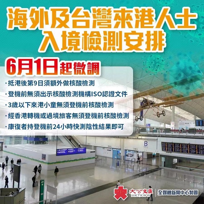 政府又指,随着全球疫情进一步缓和,且香港国际机场已加强防控措施分隔转机或过境旅客以减低个案输入小区的风险,6月1日起,经香港转机或过境的旅客无须出示登机前48小时核酸检测证明。