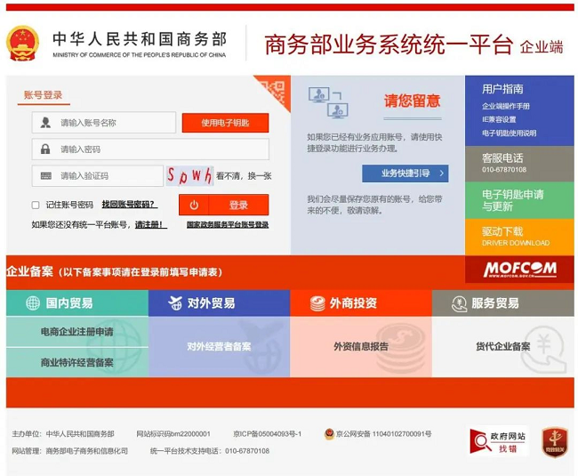 商务部业务系统统一平台企业端:https://ecomp.mofcom.gov.cn/loginCorp.html