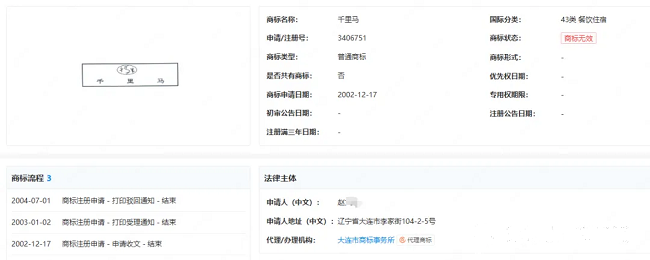 2002年12月,一位来自沈阳的先生拿着“三千里”在餐饮类别中的商标专用权证书,要求赵某立刻将旗下的5家烤肉门店改名。由于没有提前注册商标,赵某在这场商标纠纷中毫无还手之力,无奈之下,他只能将5家烤肉店全部更名为“千里马”烤肉。