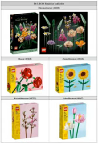 Wibra以“迷你积木花卉组合”(Mini Block Flower Arrangement)和“迷你积木趣味动物”(Mini Block Funny Animals)为名销售花卉及动物造型积木(见附图),产品均由塑料积木构成。