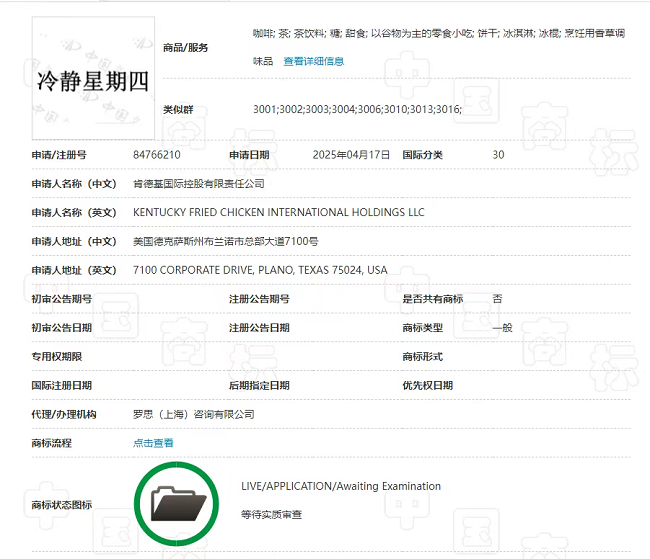 而在2025年04月17日,肯德基国际控股有限责任公司申请注册“冷静星期四”的商标,国际分类涉及30类方便食品,当前商标状态为等待实质审查。