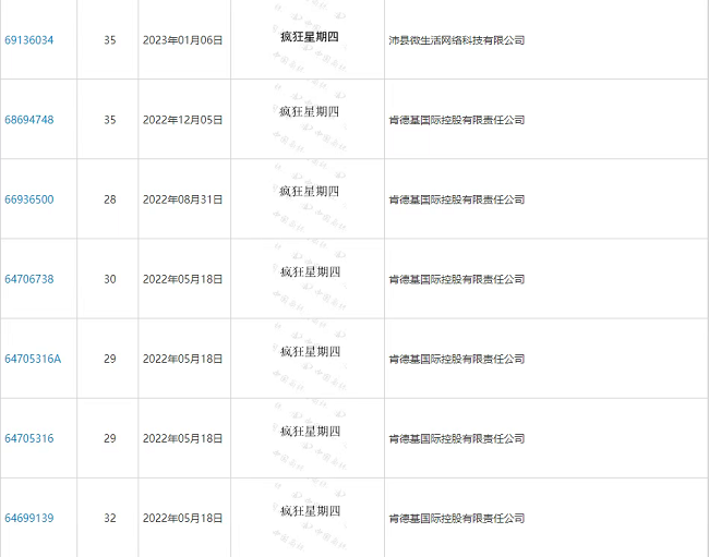 据悉,疯狂星期四为肯德基每周四的固定活动,至少在2018年就推出相关促销活动,还找了明星代言人各路宣传,可惜一直效果甚微。2020年末,“疯狂星期四”被网友发掘和再创造,《疯狂星期四文案合集》每周四定时在各个群聊中滚动刷屏,成功爆红网络。可能是肯德基察觉到了热度,便在2021年四月及时注册了商标,现在商标也成功注册,还是很有先见之明的。当然另有几家公司也都曾分别申请注册“疯狂星期四”商标,最终未能成功。而肯德基于今年5月申请的方便食品、啤酒饮料类、食品类“疯狂星期四”商标流程当前为“驳回通知发文”或“受理通知书发文”。