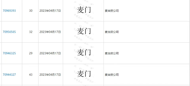 就连麦当劳也趁热打铁,在方便食品、啤酒饮料、餐饮住宿类等类别上申请注册了多个“麦门”商标——“麦门”为“麦当劳忠实门徒”的简称,麦当劳忠实粉丝在网上玩梗自称为“麦门信徒”。