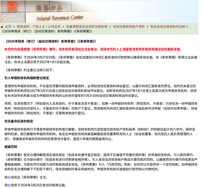 最近,香港税务领域传来一则重磅消息,牵动着不少关注跨境资产的人的心——《2026年税务(修订)(自动交换资料)条例草案》已于3月27日正式刊宪,并在4月1日提交立法会首读。这意味着,讨论已久的香港版CRS 2.0,终于从传闻走向现实,即将落地实施。
